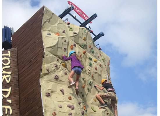 Rock Climbing: The big rock wall at the base of the mountain is a challenge all kids will want to master. Below are two of our nimble spiders just about to ring the bell at the top. Littler climbers can also get in on the action with a free climb on a smaller rock wall with mom or dad as a spotter instead of a harness. Adventurers as young as 5 can also learn to climb a natural cliff face and climbers 8 and up can join a guided rock climbing excursion in the Mont Tremblant National Park.